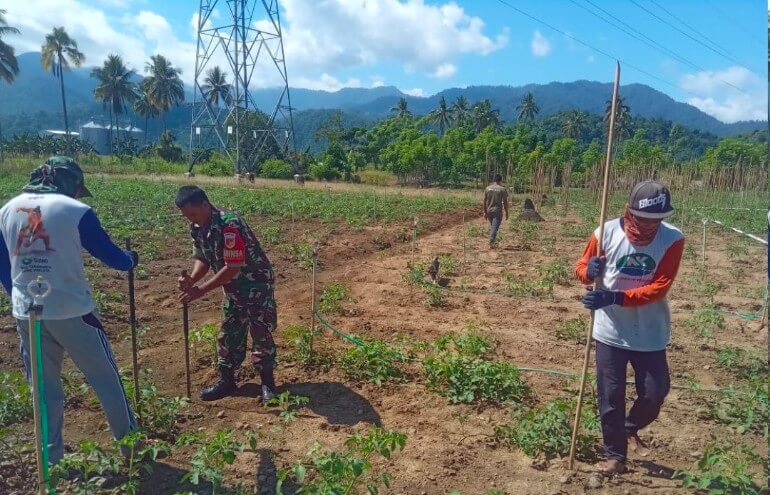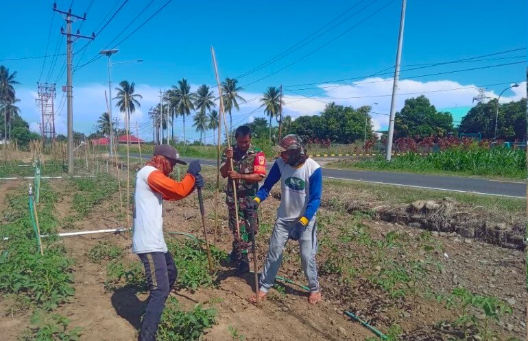 Dengan tangan yang biasa memegang senjata, hari itu Babinsa Sertu Musoleh justru sibuk menancapkan bambu dan mengikat batang tomat satu per satu.