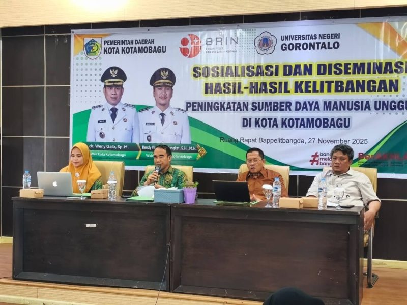 komunikasulut.com – Pemkot Kotamobagu Melalui Badan Perencanaan Penelitian dan Pengembangan Daerah (Bappelitbangda) Kota Kotamobagu melaksanakan Sosialisasi dan Diseminasi Hasil-Hasil Kelitbangan untuk Peningkatan Sumber Daya Manusia (SDM) Unggul sebagai langkah awal mendapatkan masukan mewujudkan misi daerah yakni mendorong inovasi dan SDM dengan fokus utama mendukung akses dan mutu pendidikan secara merata serta peningkatan SDM unggul melalui bantuan pendidikan dan beasiswa, bertempat diruang Rapat Bappelitbangda, Jalan Kampus Mogolaing, Kamis (27/11/2025).