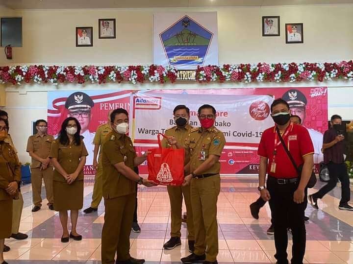Kali ini, Bupati Minut Joune Ganda dan Wakil Bupati Kevin W Lotulung, menerima bantuan sembako bagi masyarakat yang terdampak Covid-19 dari perwakilan Alfamart, Senin (26/7/2021).