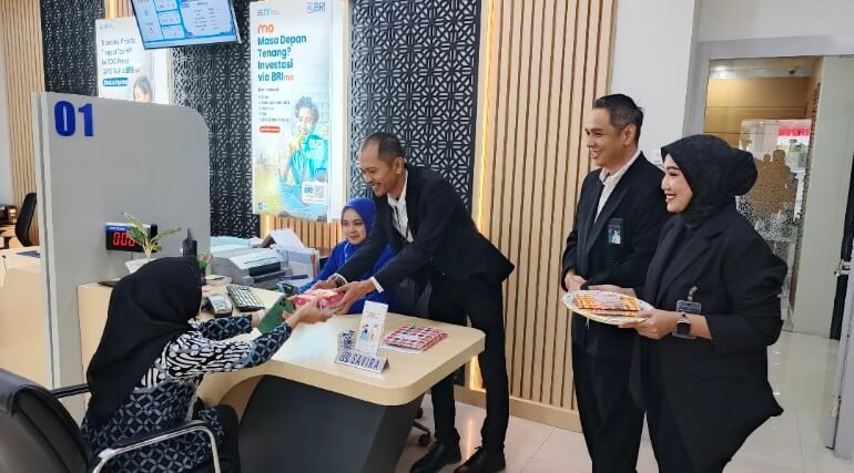 Pinca dan karyawan membagikan bingkisan pada saat melayani Para nasabah setia yang hendak melakukan transaksi saat berada di Bank BRI.