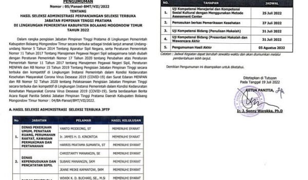 Pendaftaran Selter JPT Pemkab Boltim Telah Berakhir