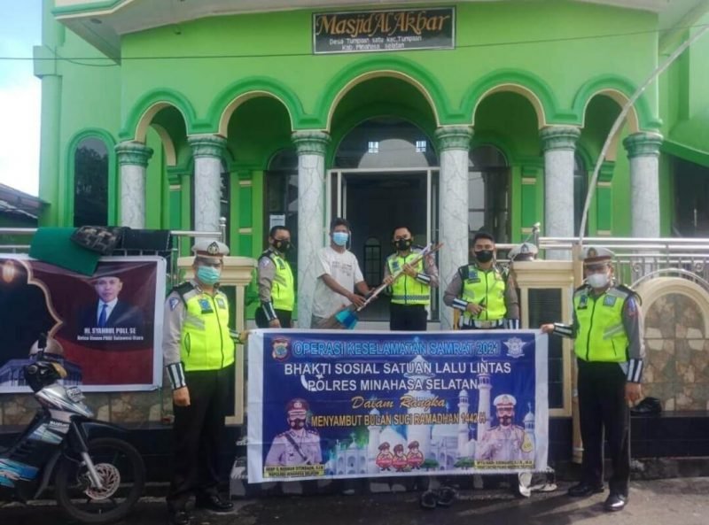 KOMUNIKASULUT.COM – Personel Satuan Lalu Lintas (Satlantas) Polres Minahasa Selatan (Minsel) menggelar bakti sosial di Masjid Al-Akbar Desa Tumpaan Satu, Kecamatan Tumpaan, Jum’at (23/04/2021) pagi.