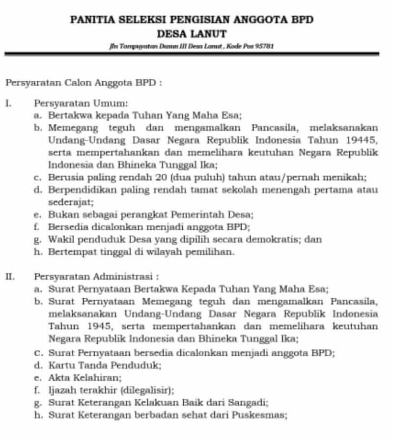 Berdasarkan Surat Sekretariat Daerah Kabupaten Bolaang Mongondow Timur Nomor: 700/Setda-Kab/0807/11/2022 Perihal Pemberitahuan Tahapan Pelaksanaan Pengisian Anggota BPD Tanggal 22 Maret Tahun 2022, maka Panitia Seleksi Pengisian Anggota BPD Desa Lanut Membuka pendaftaran Calon Anggota BPD masa jabatan 2022-2027.