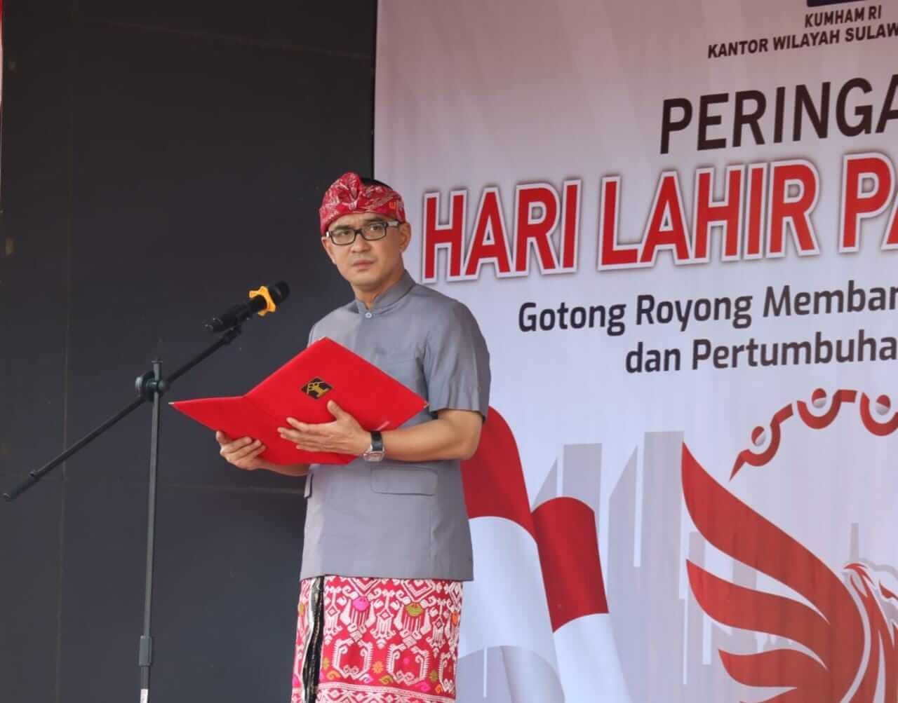 Kepala Kantor Wilayah Kemenkumham Sulawesi Utara Ronald Lumbuun bersama jajarannya mengikuti upacara peringatan Hari Lahir Pancasila secara virtual dari lapangan Kanwil. Presiden Joko Widodo (Jokowi) hadir untuk memimpin upacara yang dipusatkan di Lapangan Selatan Monas, Jakarta Pusat.
