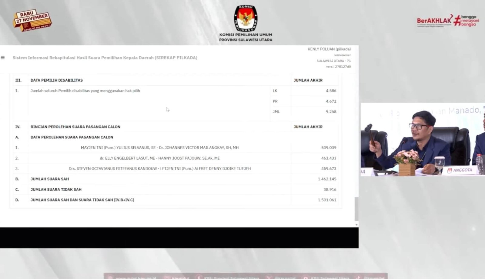 Pleno provinsi dapat dilihat kembali dalam siaran live di Channel resmi KPU Sulut (https://www.youtube.com/live/ucEuPAAMDRc?si=pOJtcsy06la9NJRf).