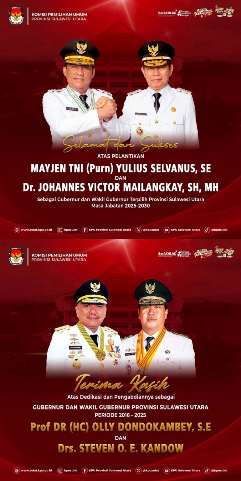 Di sisi lain, KPU Sulut juga menyampaikan ucapan selamat dan sukses kepada Mayjen TNI (Purn) Yulius Selvianus Komaling, S.E., dan Dr. Johaness Victor Mailangkay, S.H, M.H, yang telah resmi dilantik sebagai Gubernur dan Wakil Gubernur Sulawesi Utara periode 2025-2030.