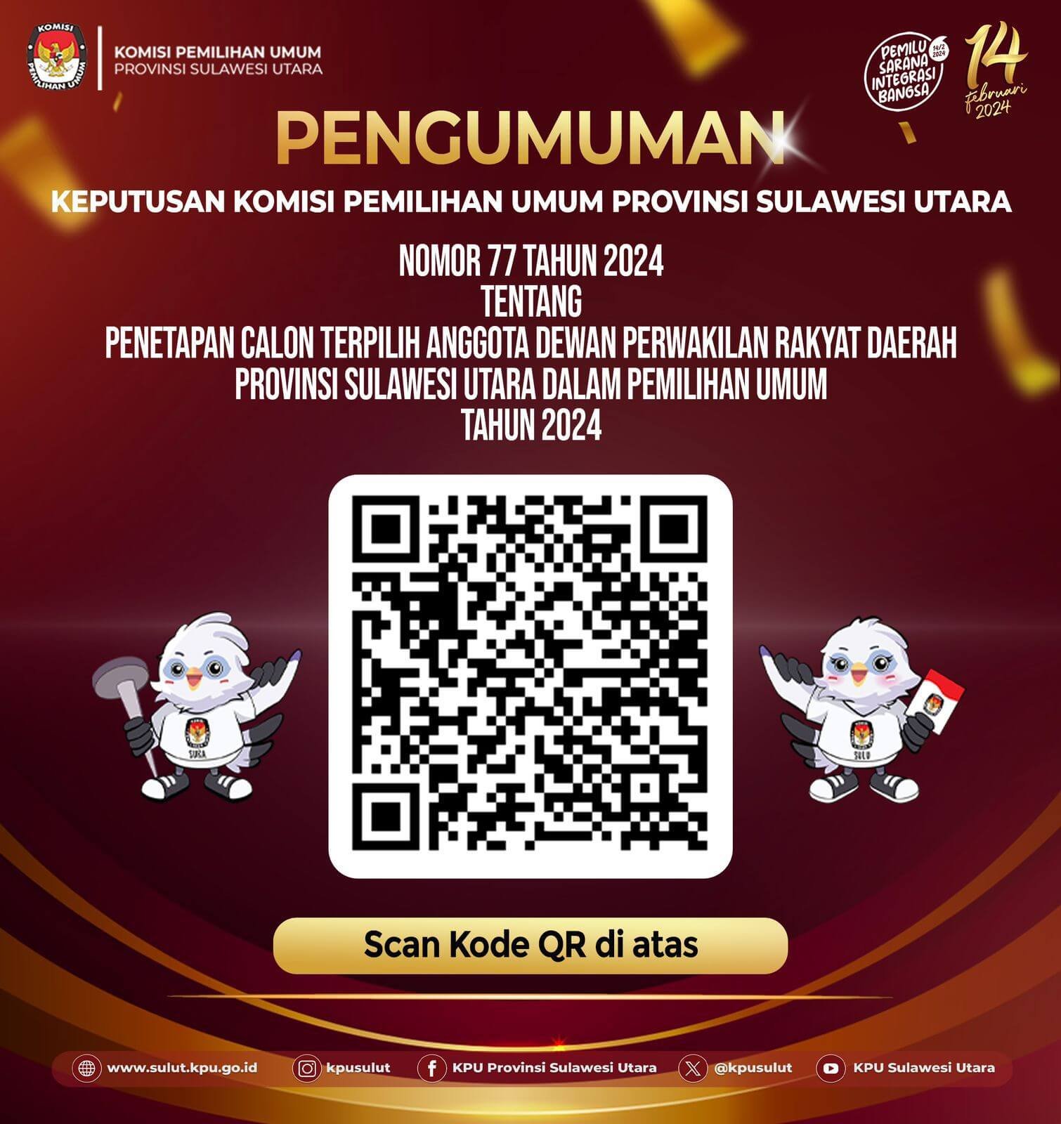 Penetapan dilakukan lewat Rapat Pleno Terbuka KPU Sulut di Hotel Four Points Manado, Kamis (13/6/2024). Hasil penetapan dituangkan dalam Keputusan KPU Sulut Nomor 77 tahun 2024 sebagai berikut: