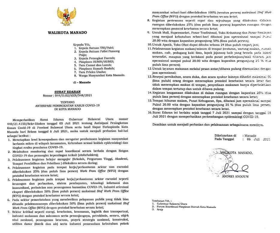 Ini berdasarkan Surat Edaran Walikota Nomor: 044/D.02/KES/548/2021 tentang Antisipasi Peningkatan Kasus Covid-19 di Kota Manado, yang ditandatangani Andrei Angouw pada Selasa (6/7/2021).