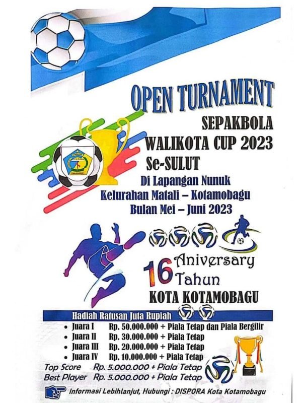 “Pendaftaran sudah di buka, akan tetapi secara resmi harus tertulis. Dan Open Tournament Walikota Cup 2023 ini se Sulawesi Utara (Sulut),” ujarnya, kamis (4/5/2023).