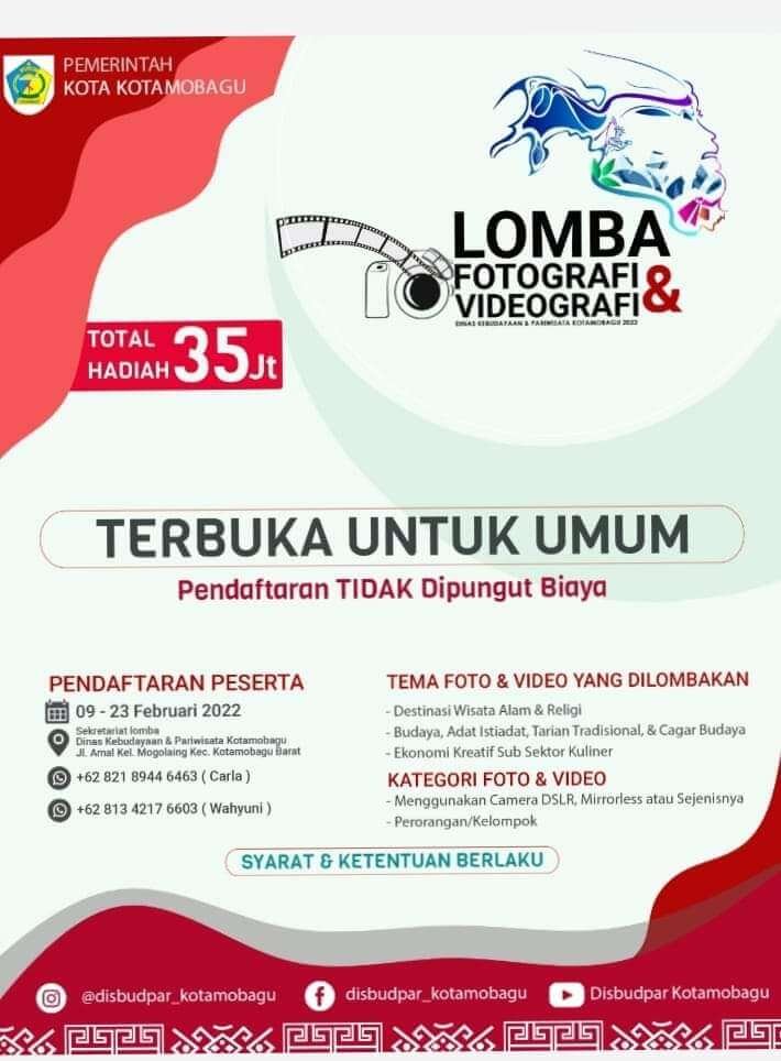 Kotamobagu – Dinas Kebudayaan dan Pariwisata (Disbudpar) Kotamobagu akan menggelar lomba Fotografi dan Videografi untuk masyarakat umum.