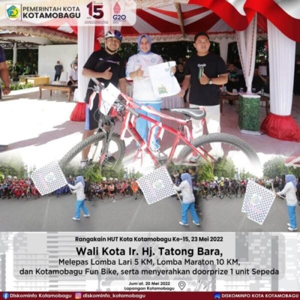 khaki-bee-173050.hostingersite.com – Walikota Kotamobagu Ir Hj Tatong Bara melepas para peserta lomba lari 5 dan 10 KM dan lomba fun Bike dalam rangkaian peringatan HUT Kotamobagu ke 15 yang acara puncaknya 23 Mei mendatang.