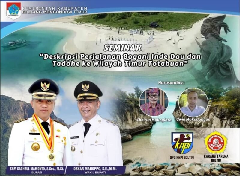 Seminar dengan tema “Deskripsi Perjalanan Bogani Inde Dou dan Tadohe ke Wilayah Timur” ini akan dilangsungkan pada Kamis (7/7/2022) pukul 9.30 Wita, bertempat di Aula Lantai III Kantor Bupati Boltim, dengan menghadirkan Chairun Mokoginta dan Uwin Mokodongan sebagai Narasumber.