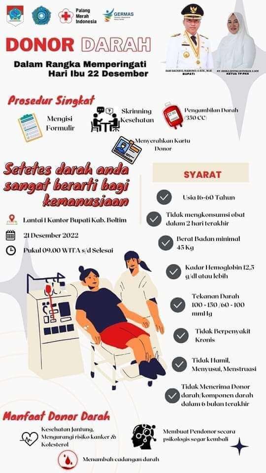 khaki-bee-173050.hostingersite.com – Dalam rangka memperingati Hari Ibu yang jatuh pada Kamis 22 Desember 2022 mendatang, Pemerintah Kabupaten Bolaang Mongondow Timur (Boltim), Bersama Tim Penggerak Pemberdayaan Kesejahteraan Keluarga (TP-PKK) dan Palang Merah Indonesia (PMI) Akan mengelar kegiatan donor darah.