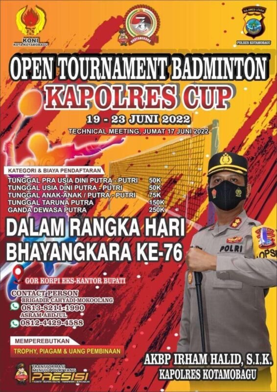 khaki-bee-173050.hostingersite.com – Open Tournament Badminton Kapolres Cup akan digelar di Kotamobagu tanggal 19 hingga 23 Juni 2022 mendatang.