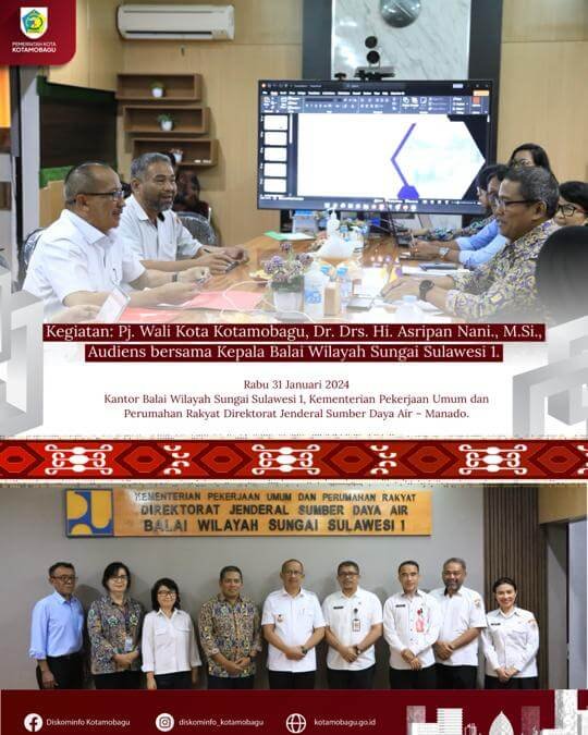 “Tepat hari ini, Pj. Wali Kota Kotamobagu, Bapak. Dr. Drs. Hi. Asripan Nani, M.Si., melaksanakan audiens dengan Kepala Balai Wilayah Sungai Sulawesi 1, Bapak Ir. Sugeng Harianto, M.Si., M.T dan jajaran, dalam rangka membahas tentang daerah irigasi yang merupakan kewenangannya Kementerian Pekerjaan Umum dan Perumahan Rakyat Republik Indonesia, yang berada di wilayah Kota Kotamobagu.nDan