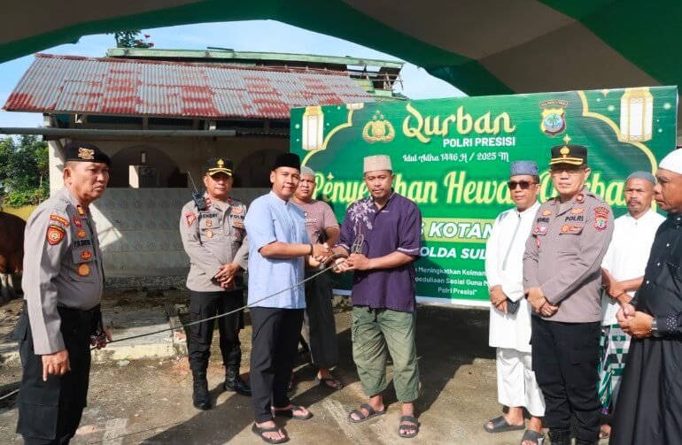Kapolres Kotamobagu AKBP Irwanto, SIK, MH menyerahkan secara simbolis sapi kurban ini kepada panitia Masjid Al-Mustaqim Polres Kotamobagu setelah pelaksanaan Sholat Ied, Jumat (6/6/2025).