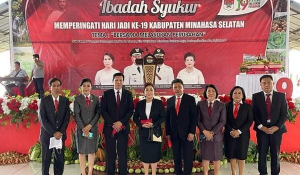 Usai upacara dilanjutkan dengan ibadah syukur yang dilaksanakan di Aula Waleta Kantor Pemkab Minsel, Ibadah Syukur Dalam Rangka Memperingati Hari Jadi ke-19 Kabupaten Minahasa Selatan dengan bertemakan “Bersama Melakukan Perubahan”, ibadah di Pimpin oleh Sekretaris Badan Pekerja Majelis Sinode GMIM Pdt. Evert Andri Alfonsius Tangel, S.Th., M.Pd.K.