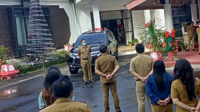 KOMUNIKASULUT.COM – Sekretaris Daerah Kota Tomohon Edwin Roring SE ME memimpin apel kerja Aparatur Sipil Negara (ASN) dan Tenaga Kontrak (Nakon) di Sekertariat Daerah Kota Tomohon, (4/1/2022).
