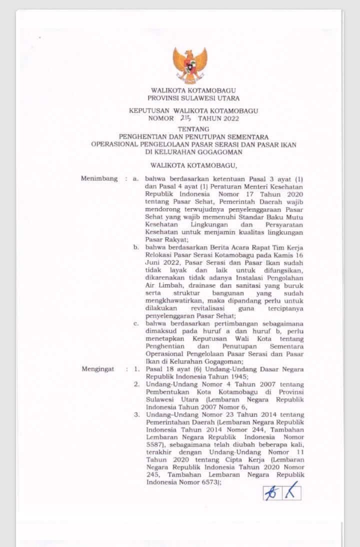 khaki-bee-173050.hostingersite.com — Kepala Bagian Hukum Setda Kota Kotamobagu Rendra Dilapanga SH M.Si., kembali memberikan penjelasan terkait Surat Keputusan Walikota Kotamobagu Nomor 215 pertanggal 2 Agustus 2022 terkait penghentian dan penutupan sementara operasional pengelolaan pasar serasi dan pasar Ikan di Kelurahan Gogagoman.