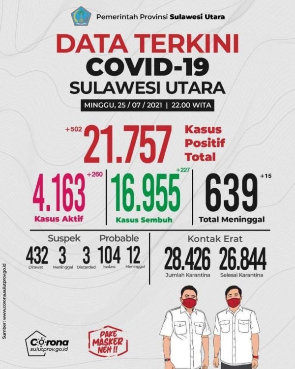 KOMUNIKASULUT.COM – Kasus harian positif covid Sulawesi Utara kembali pecah rekor. Sebagaimana data yang diumumkan Satgas Penanganan Covid-19 Sulut, Minggu (25/7), terdapat 502 kasus positif terbaru.