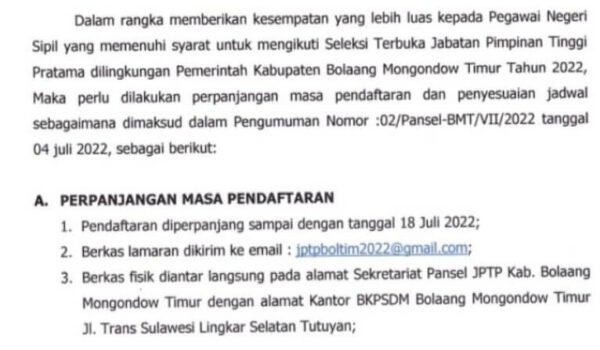 Pendaftaran Selter JPT Pemkab Boltim Telah Berakhir
