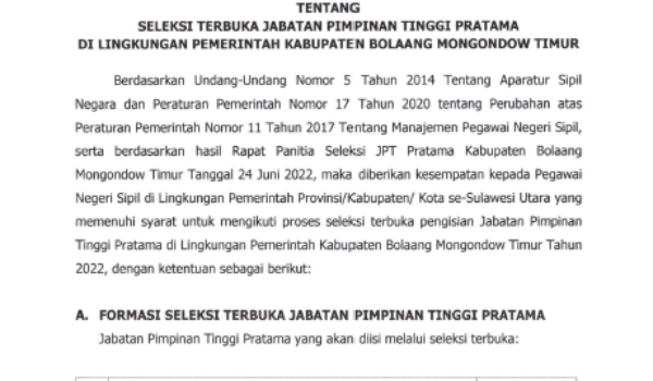 khaki-bee-173050.hostingersite.com – Pemerintah Kabupaten Bolaang Mongondow Timur (Boltim) melalui Panitia Seleksi Terbuka (Selter) membuka 3 […]