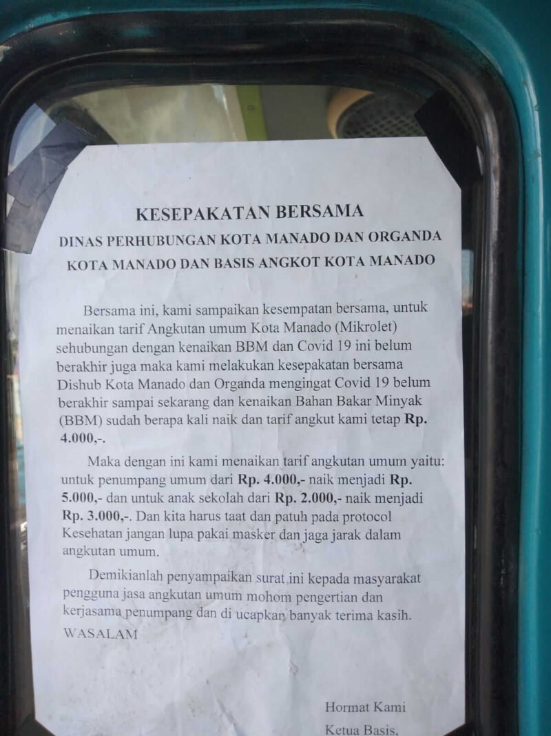 KOMUNIKASULUT.COM – Masyarakat Manado dikejutkan dengan kabar kenaikan tarif mikrolet pada Kamis (21/10/2021).